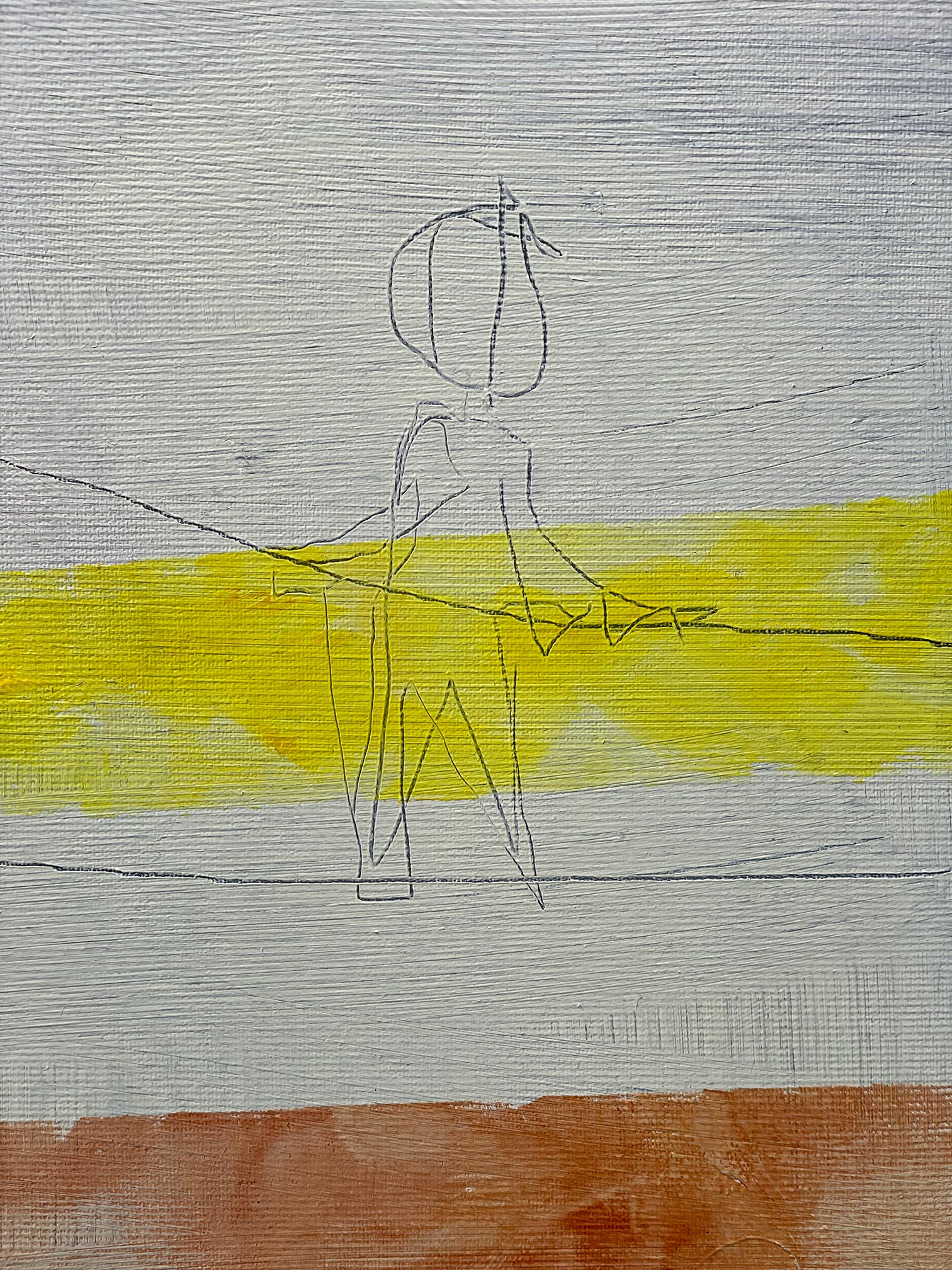 A tightrope walker poised on a streak of yellow, and below, a figure completely given over to rest — drawn in the lightest possible line, as if pressing too hard might wake them. The details reward closeness: the delicate rendering of the sleeping form, the wire barely holding the weight above. Tender and precarious in equal measure.