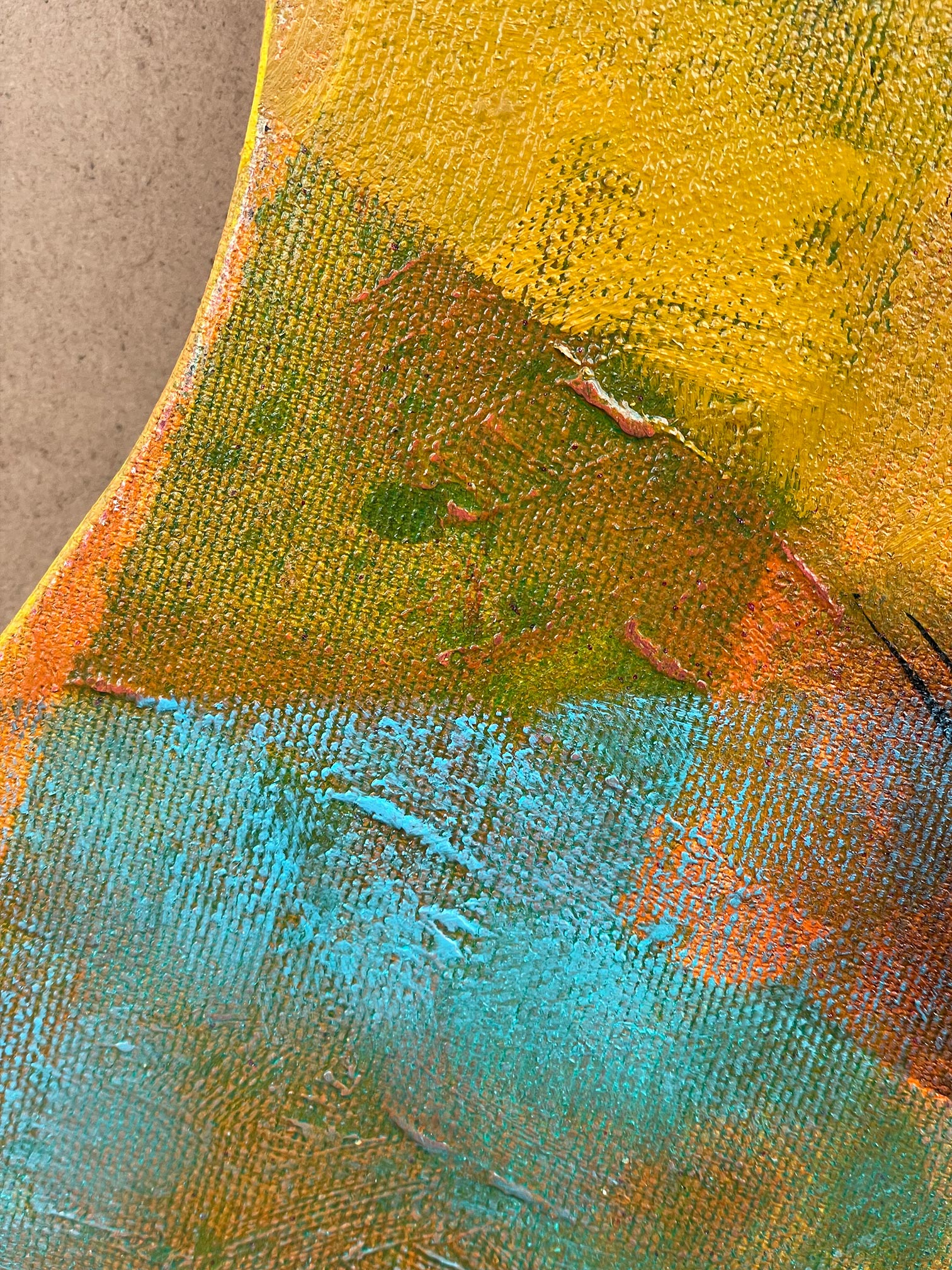 Fire at the centre, gold holding it in — yellow bands cut across a churning core of red and orange like something trying to contain what can't be contained. A face surfaces in the heat, half-dissolved, barely there. The organic edge of the canvas makes it feel less like a painting and more like something that grew this way. Raw and intense, with just enough teal breathing in from the edges to keep it from burning completely.