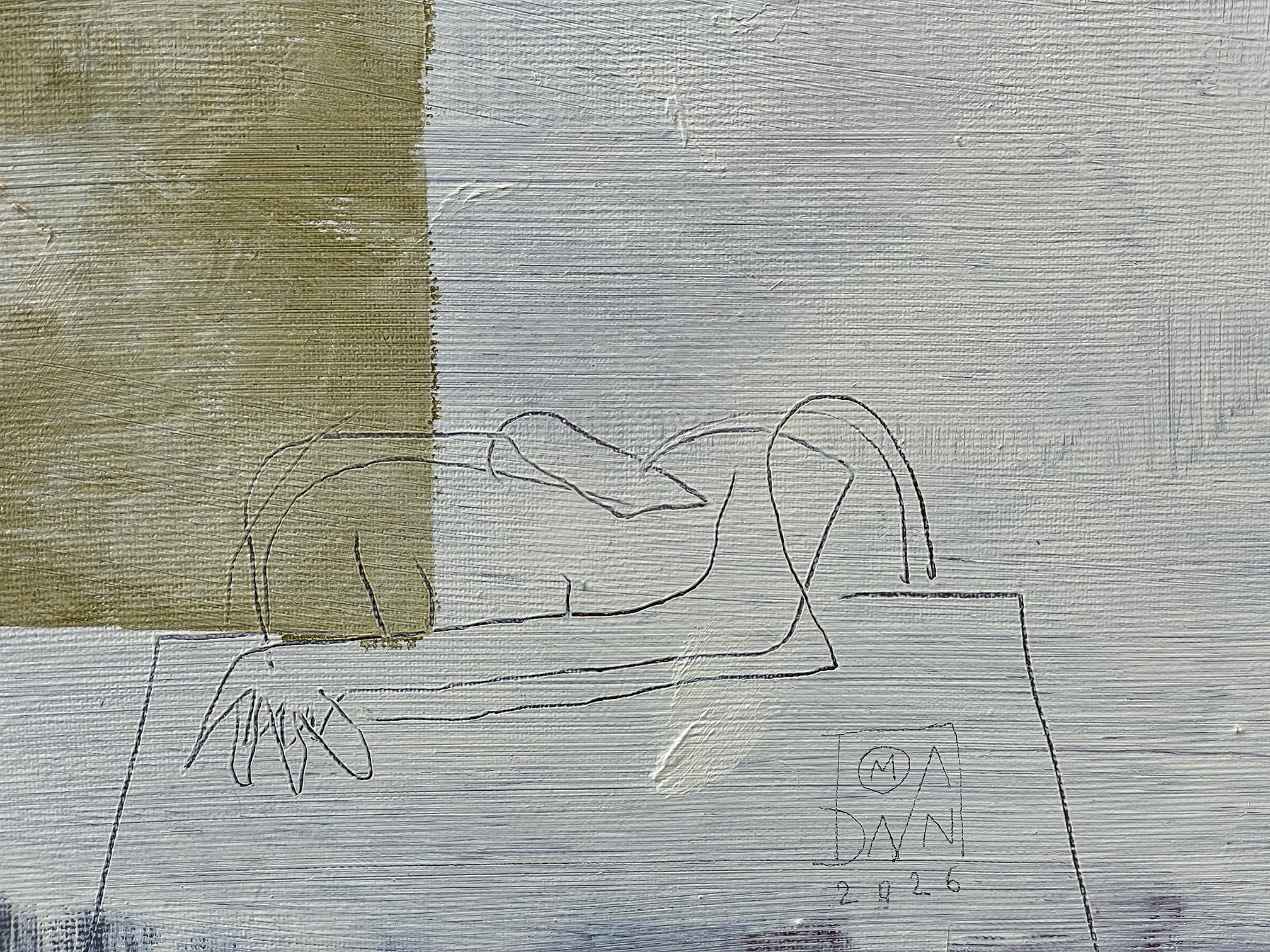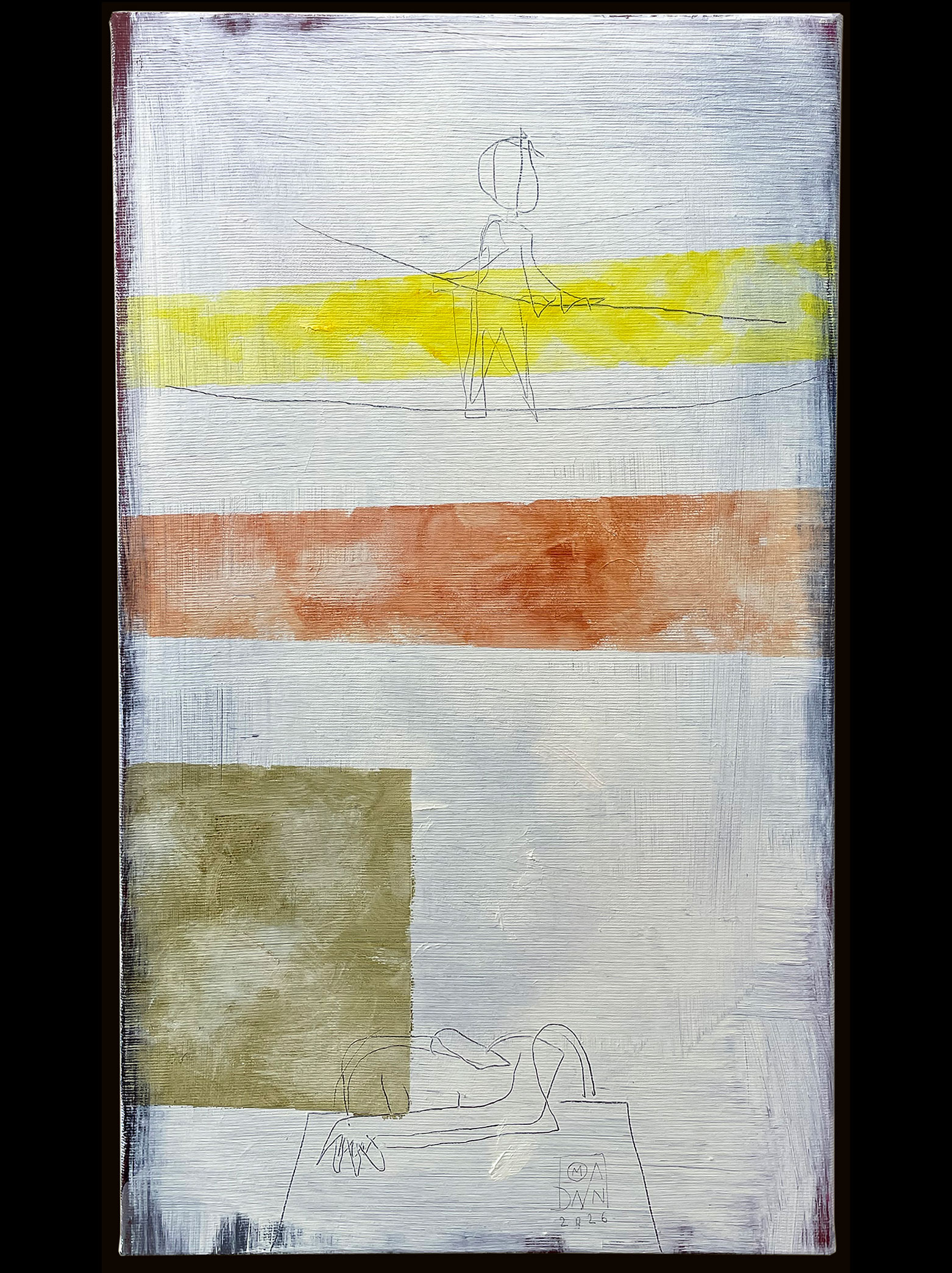 A tightrope walker poised on a streak of yellow, and below, a figure completely given over to rest — drawn in the lightest possible line, as if pressing too hard might wake them. The details reward closeness: the delicate rendering of the sleeping form, the wire barely holding the weight above. Tender and precarious in equal measure.
