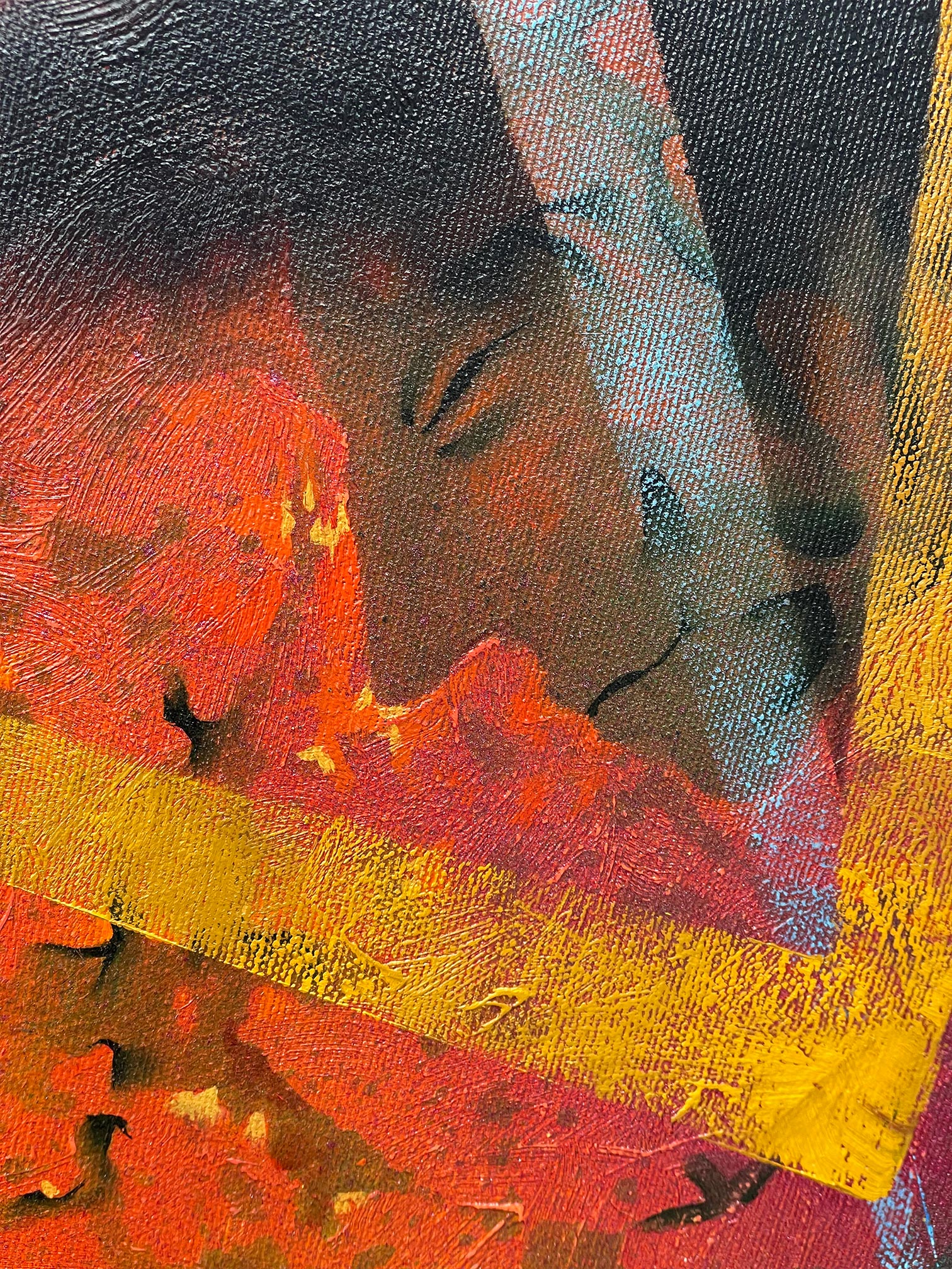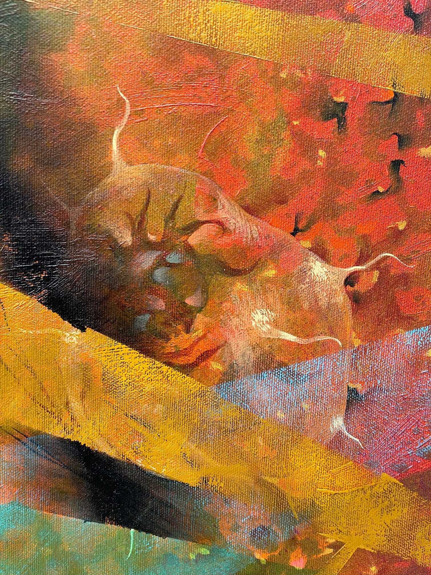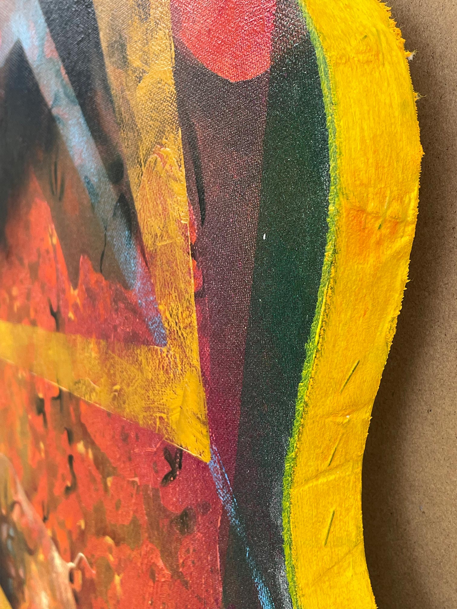 Fire at the centre, gold holding it in — yellow bands cut across a churning core of red and orange like something trying to contain what can't be contained. A face surfaces in the heat, half-dissolved, barely there. The organic edge of the canvas makes it feel less like a painting and more like something that grew this way. Raw and intense, with just enough teal breathing in from the edges to keep it from burning completely.