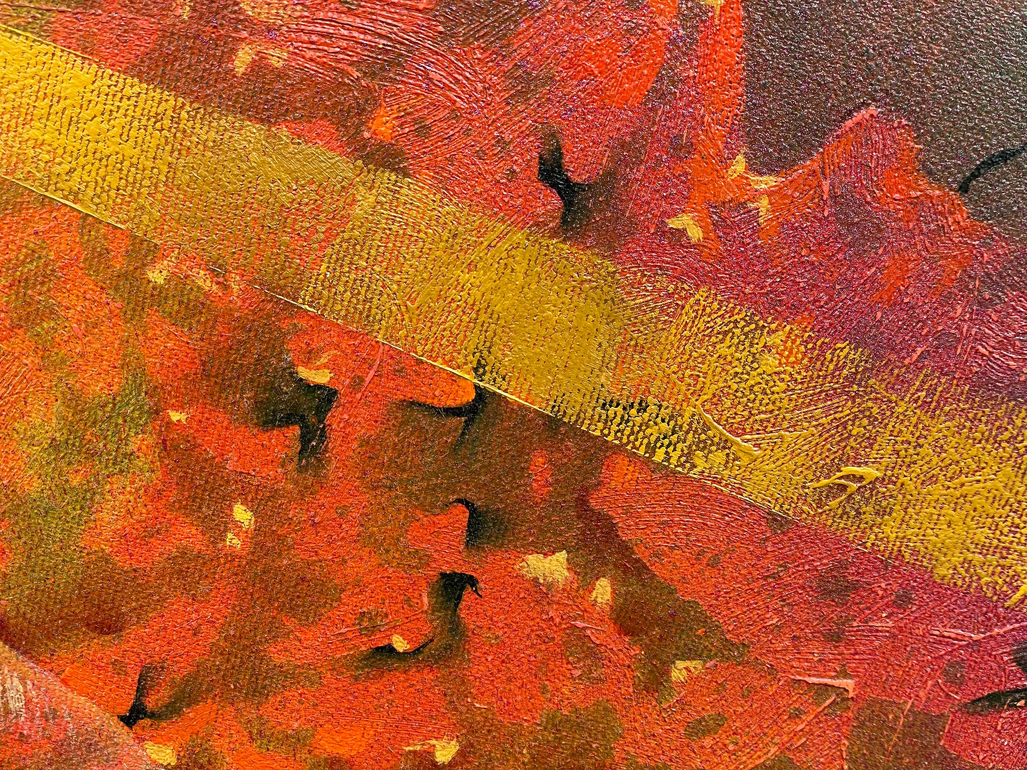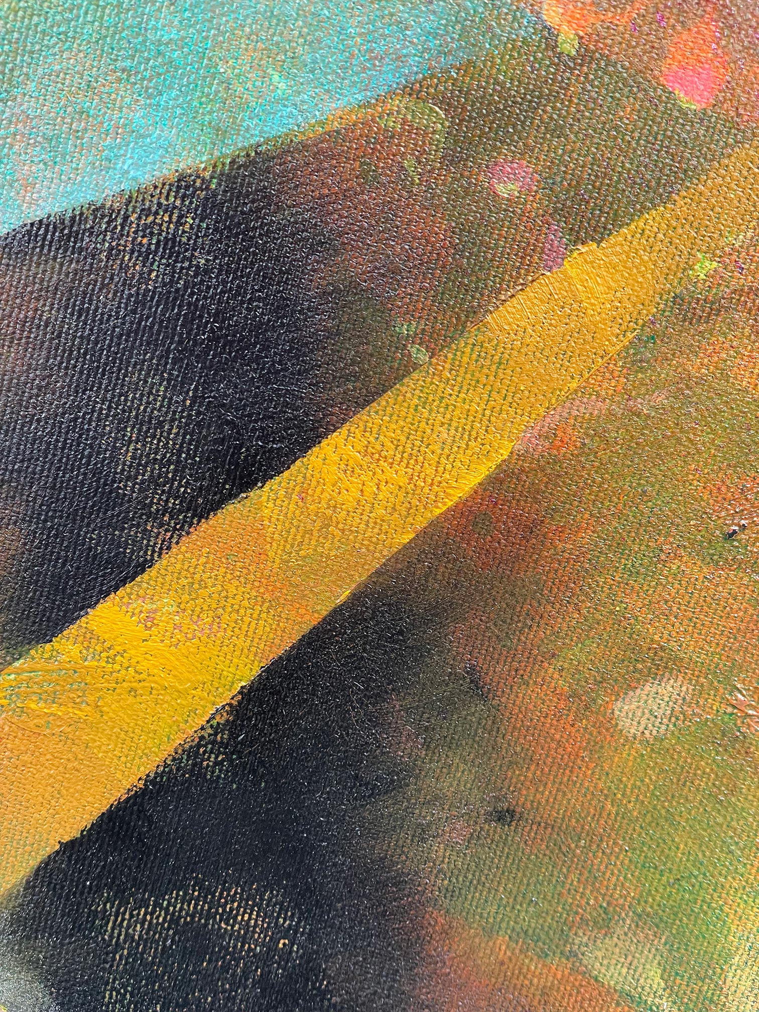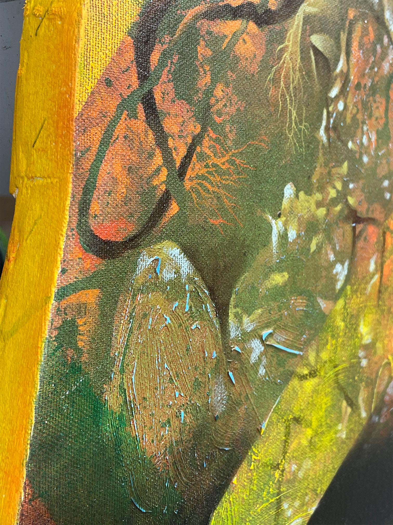 Fire at the centre, gold holding it in — yellow bands cut across a churning core of red and orange like something trying to contain what can't be contained. A face surfaces in the heat, half-dissolved, barely there. The organic edge of the canvas makes it feel less like a painting and more like something that grew this way. Raw and intense, with just enough teal breathing in from the edges to keep it from burning completely.