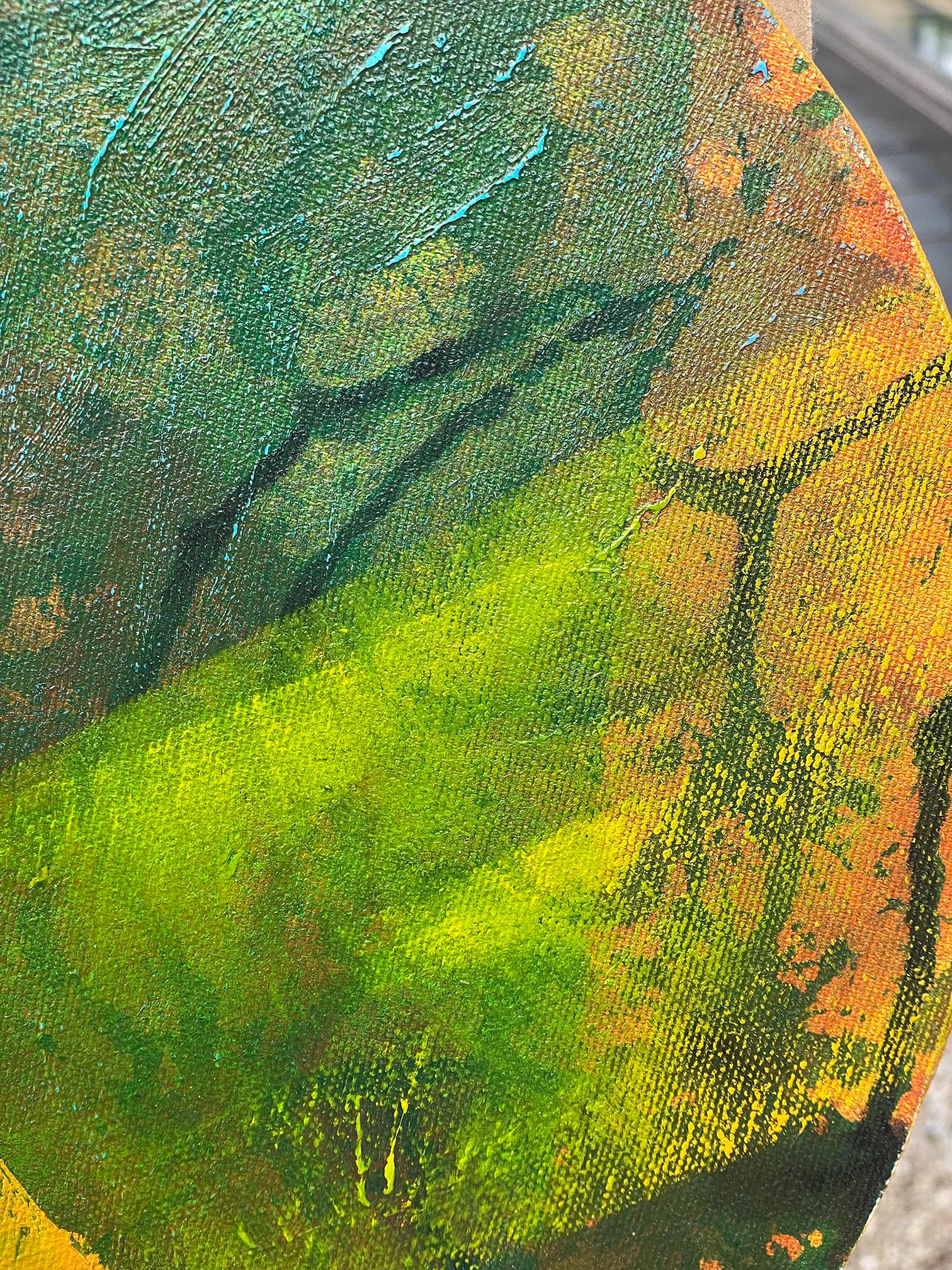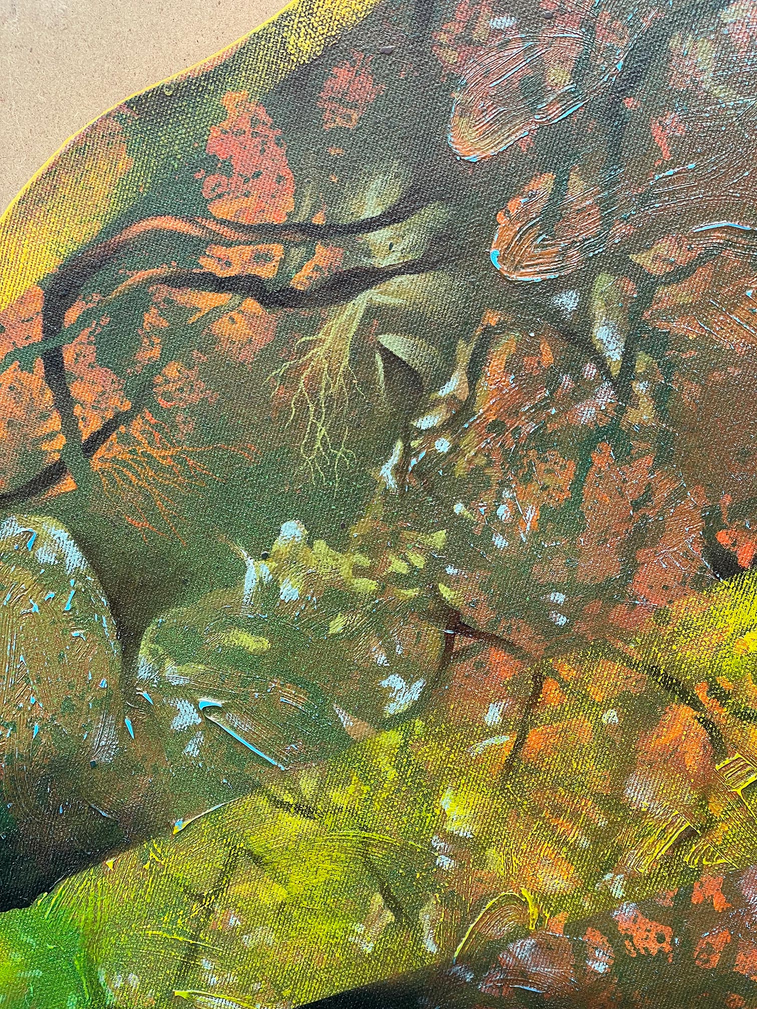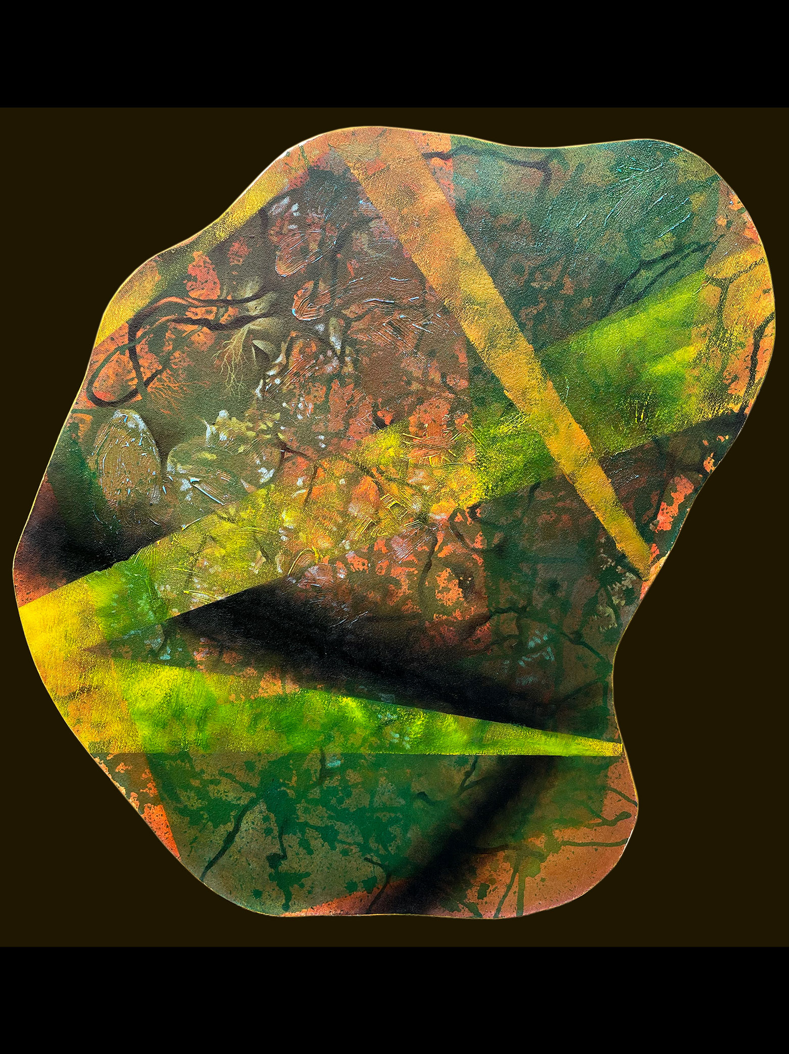 Where Shield 1 burns, this one broods. The same organic silhouette, but cooler — deep forest greens and amber pushed through by bold yellow diagonals that slice the composition open. Tangled black lines run through it like roots or veins, and something creature-like lurks in the upper left, half-emerged. It feels older, earthier, as if the fire has been through and what's left is still very much alive.