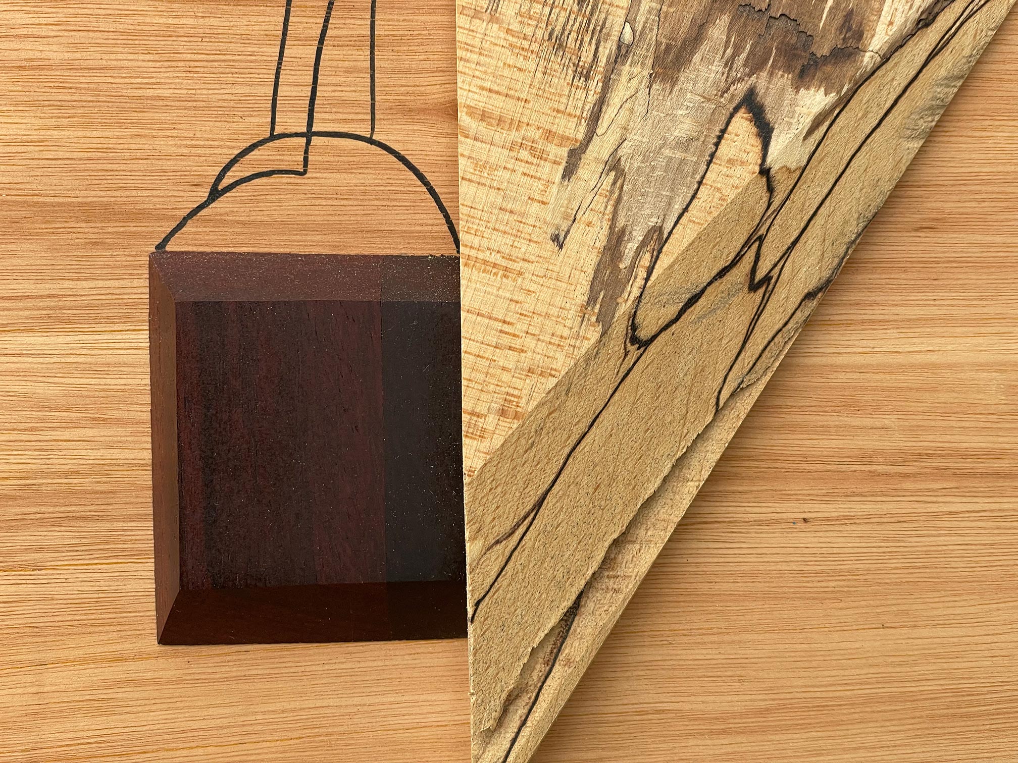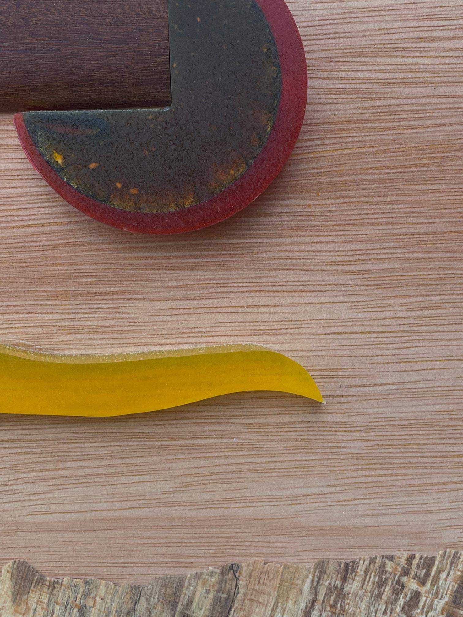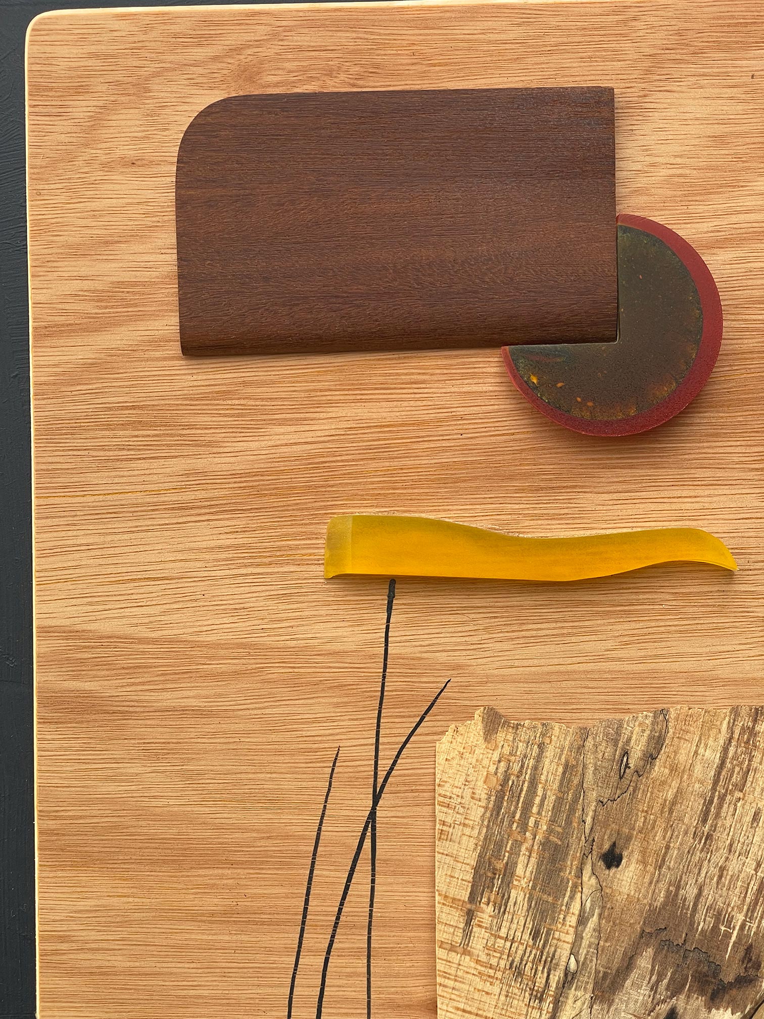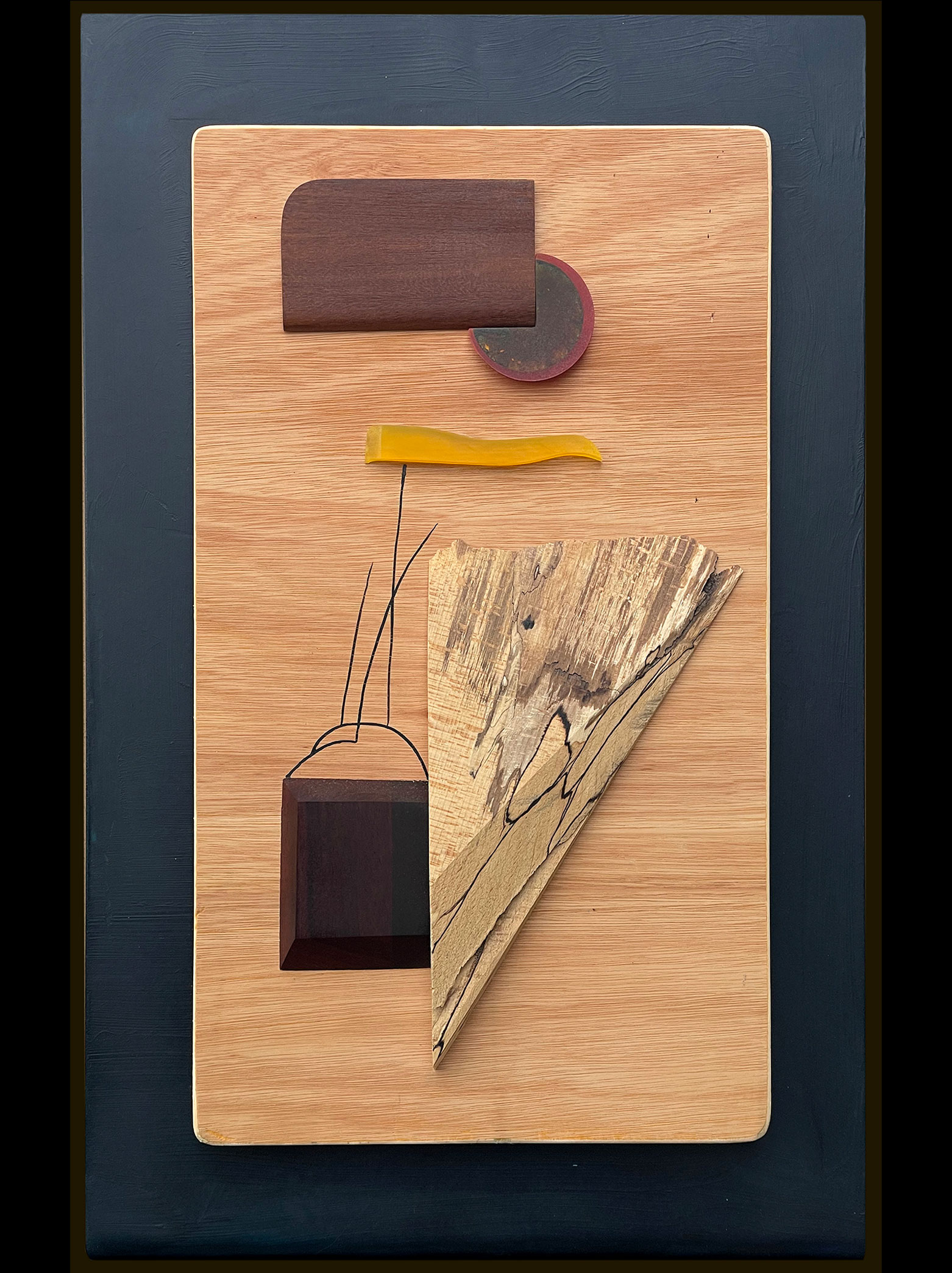 Each piece of wood chosen for its natural character — the warm grain of oak, a wedge of spalted timber veined with natural black markings, a dark cube of purplewood, a half-circle rimmed in red. Connecting them: a sinuous yellow strip of resin and a few spare drawn lines, as if the composition needed just that one gesture to come alive. Quiet and precise, with the feel of a landscape distilled to its essentials.