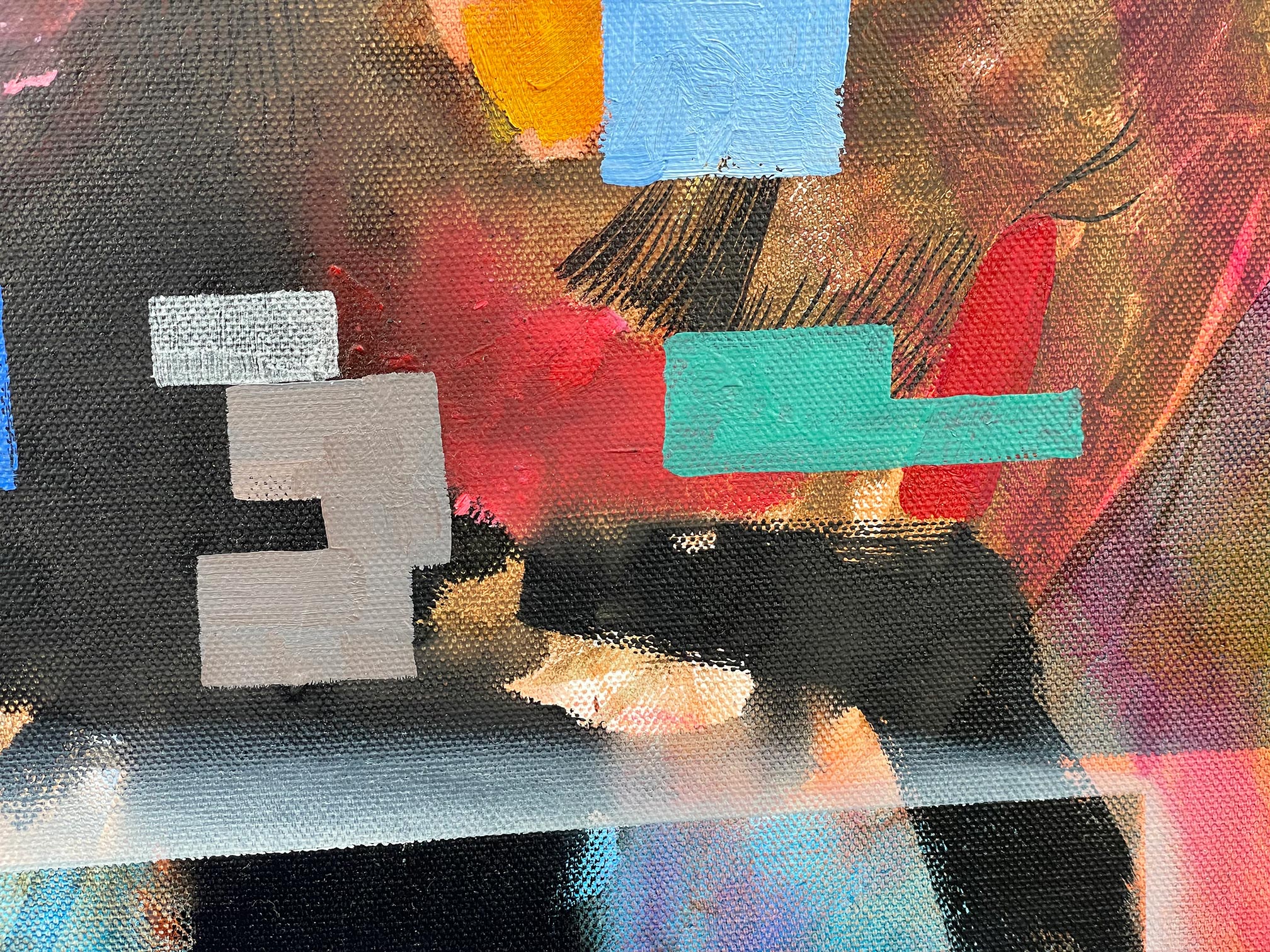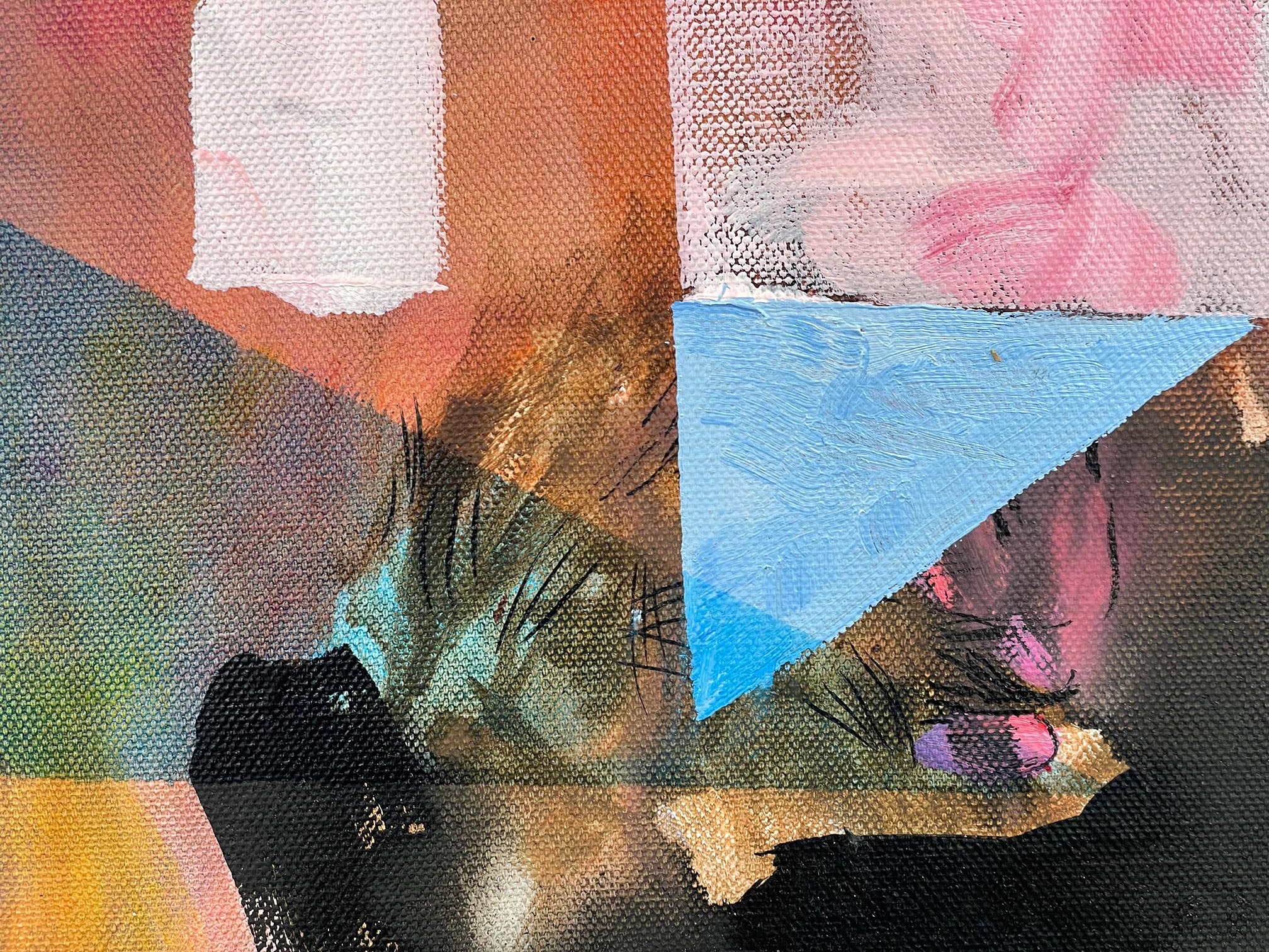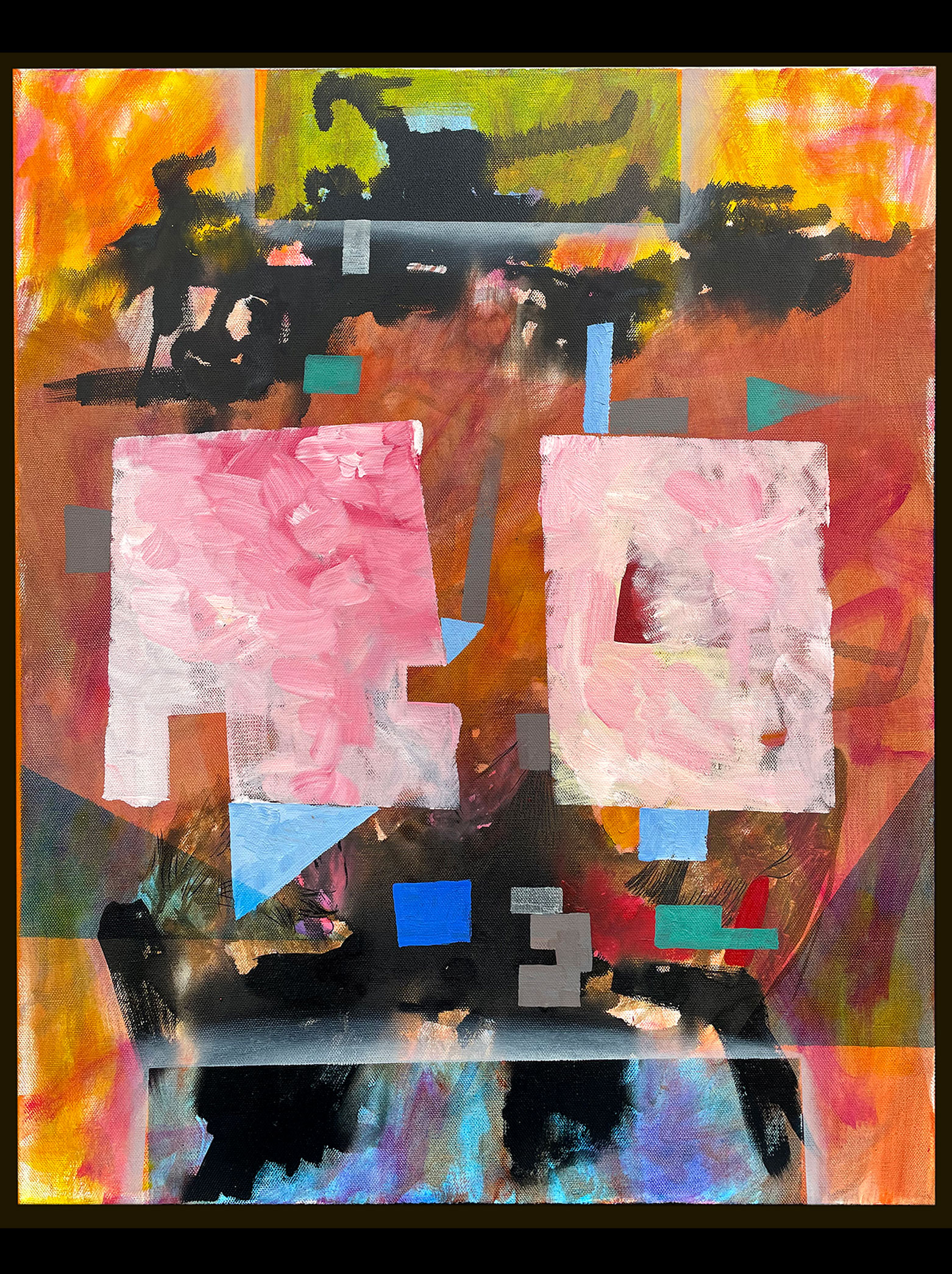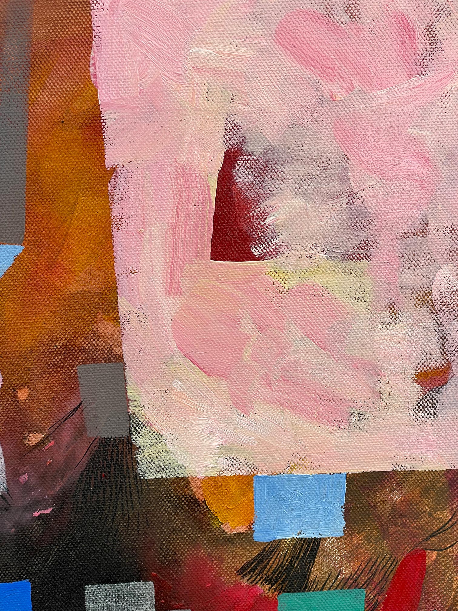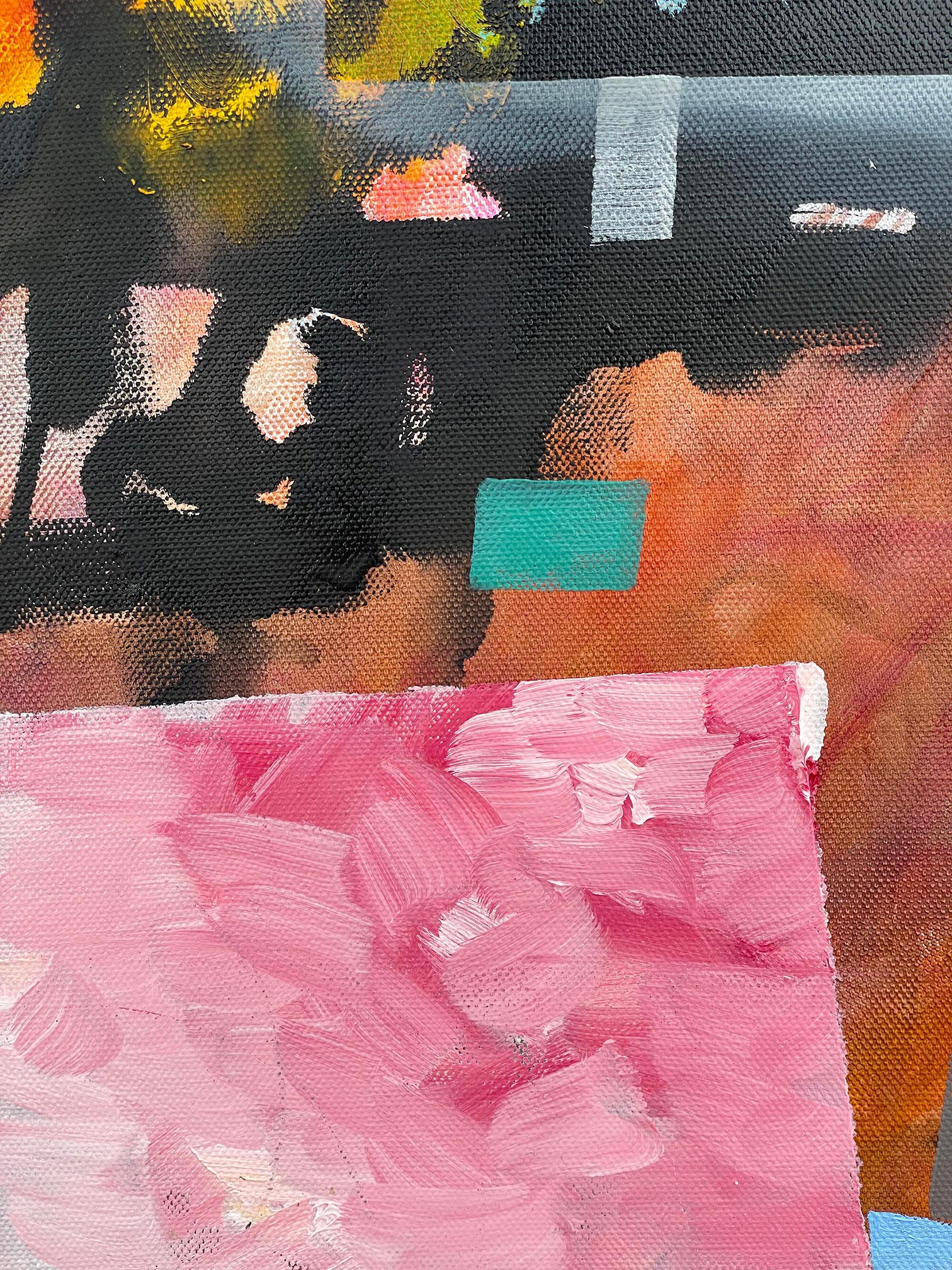 The title makes you look differently — suddenly those two blowsy pink-white squares feel like something noticed mid-stride, ordinary shapes that caught the light at the right moment. Around them, the canvas is anything but quiet: amber and orange blazing at the edges, black cutting through the middle, small bright rectangles of blue, teal and grey scattered like afterthoughts. Above it all, a chaotic frieze of dark silhouettes that could be trees, or figures, or just the noise of a city street. A painting built around a moment of accidental stillness.