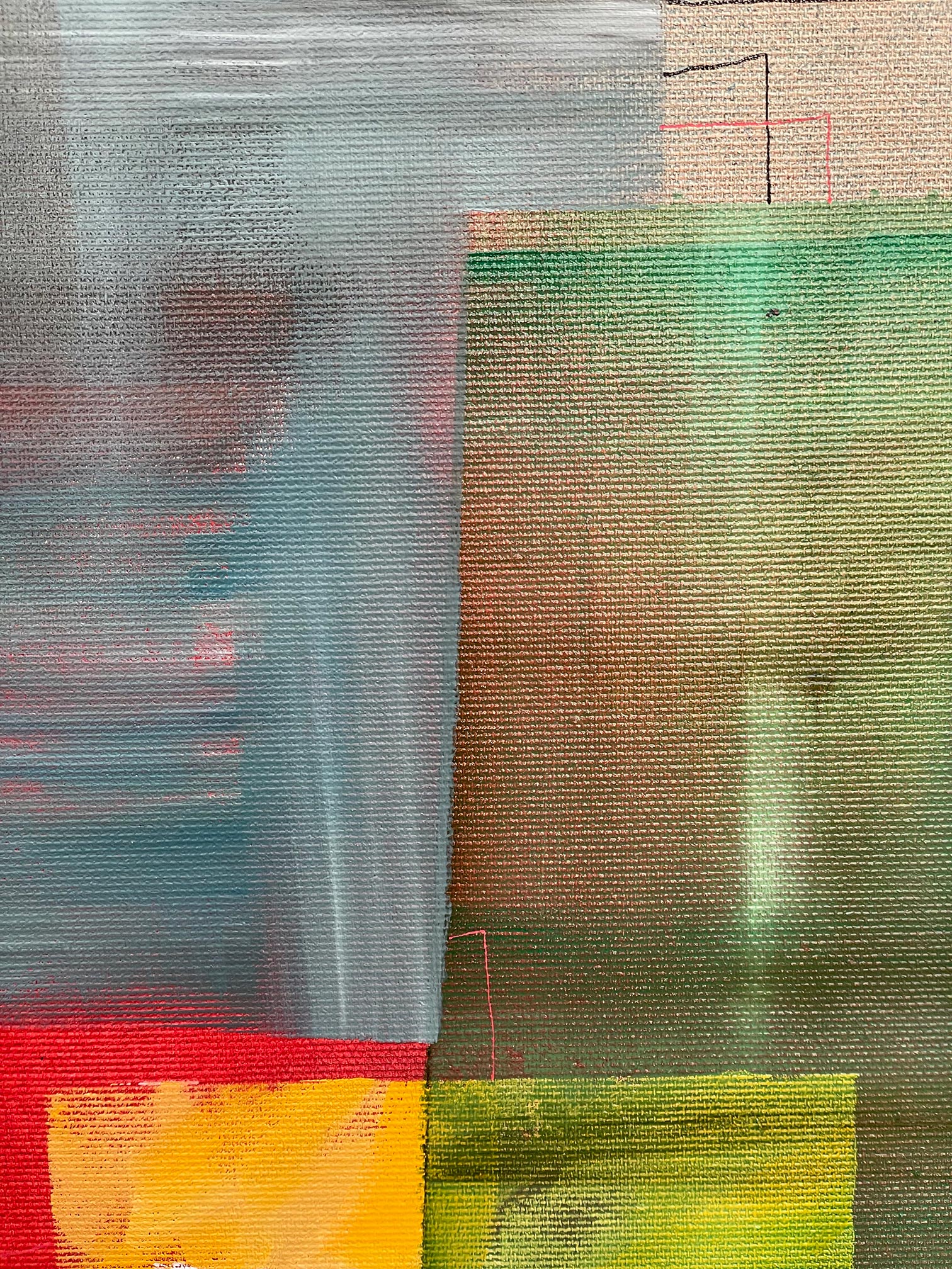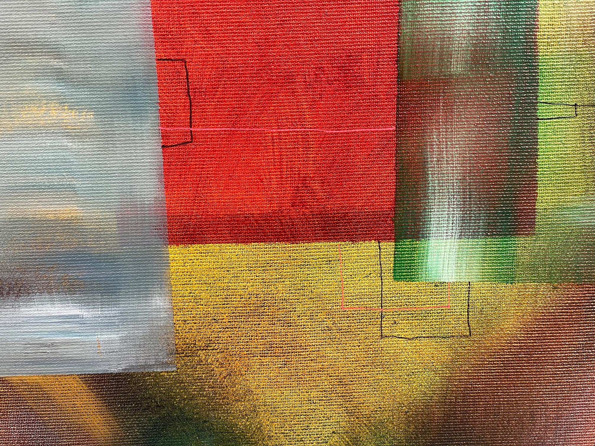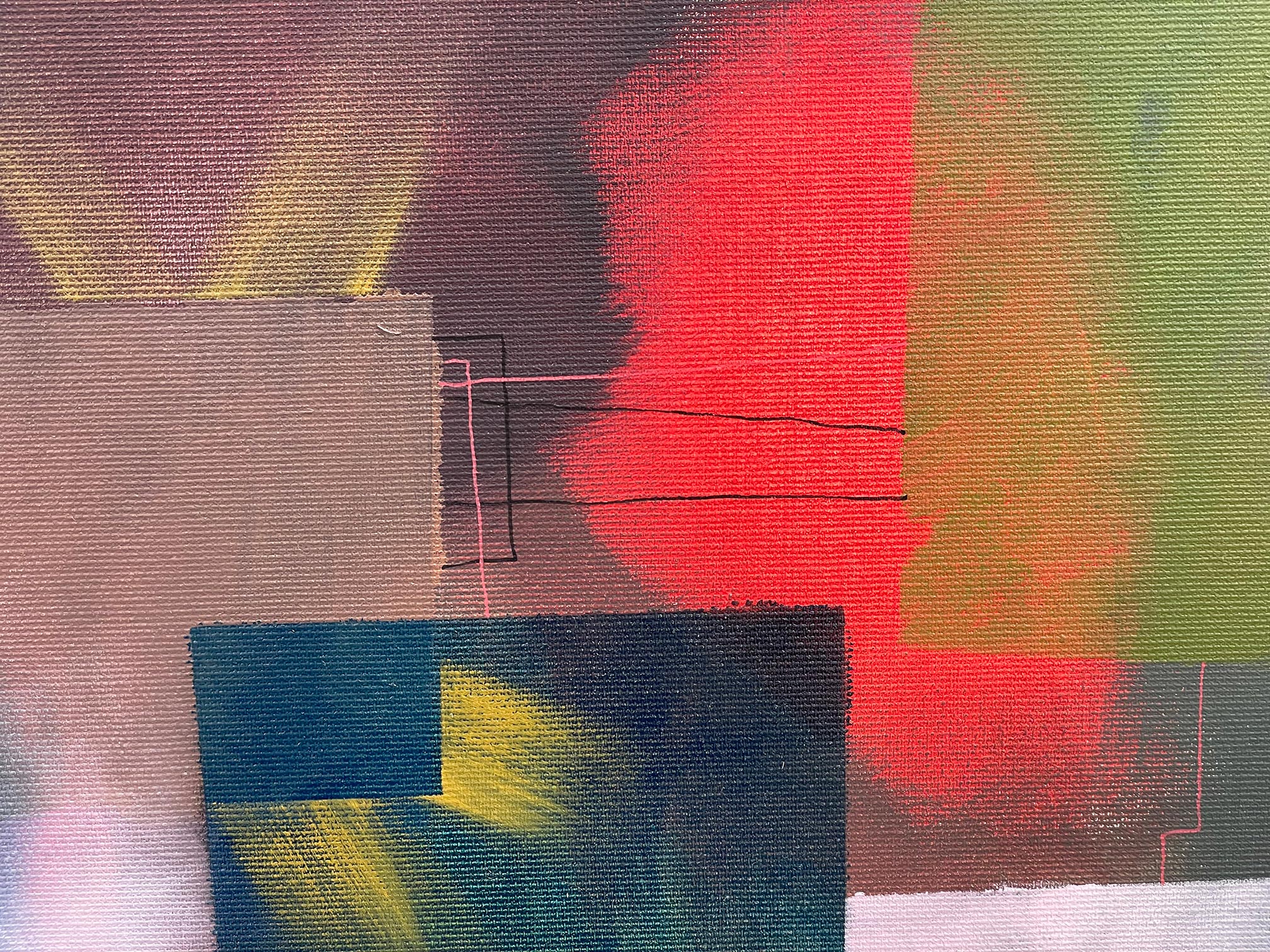 Generous and restless — blocks of teal, sage, red and yellow tumble across a softly blurred ground, each one distinct but none quite settling. The larger canvas gives the composition room to breathe and contradict itself: hard-edged rectangles against smoky, out-of-focus passages that feel like memory rather than paint. Small drawn lines and partial frames mark attempts at structure that the painting keeps outgrowing. The title lands with a wry smile — this is what an idea looks like mid-collision with reality, still colourful, still worth having.