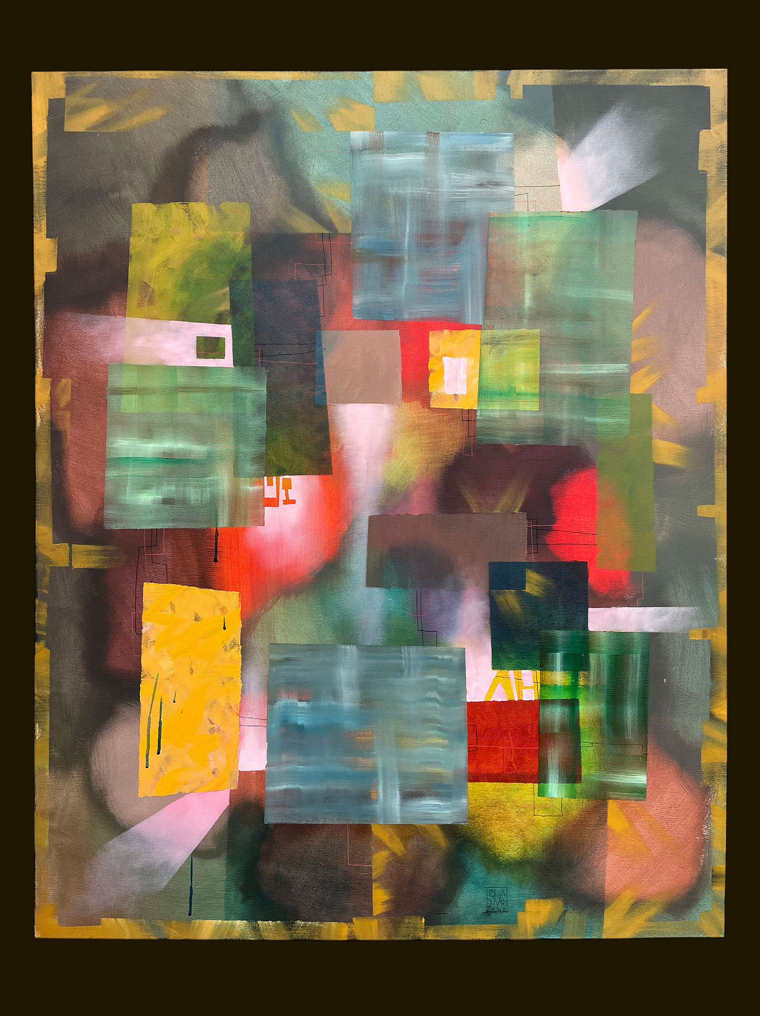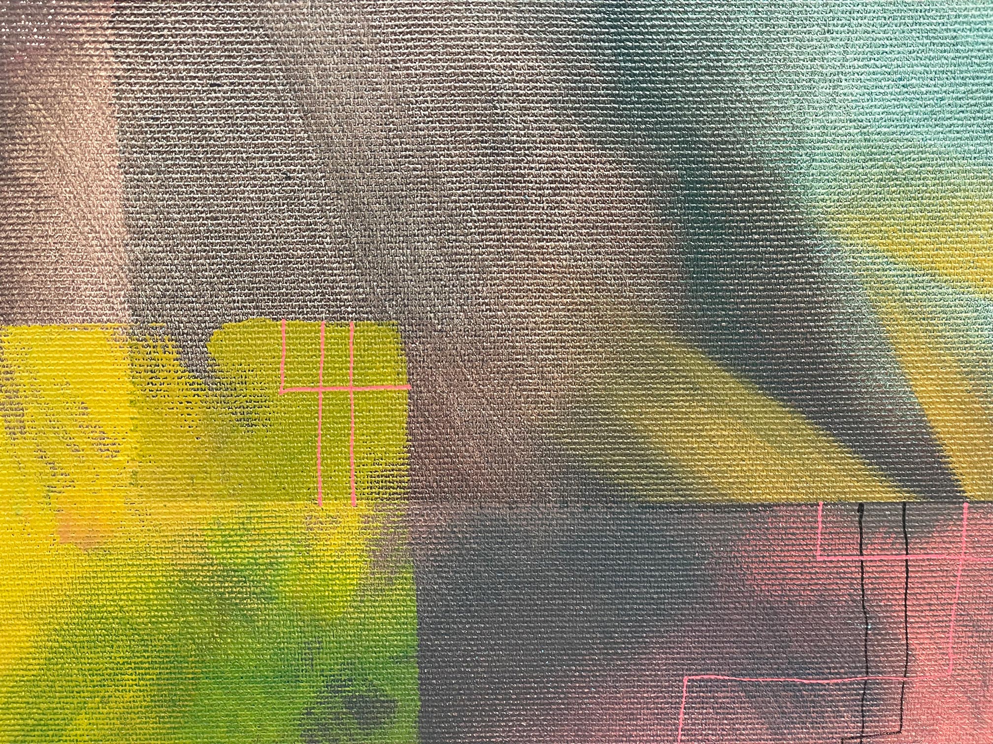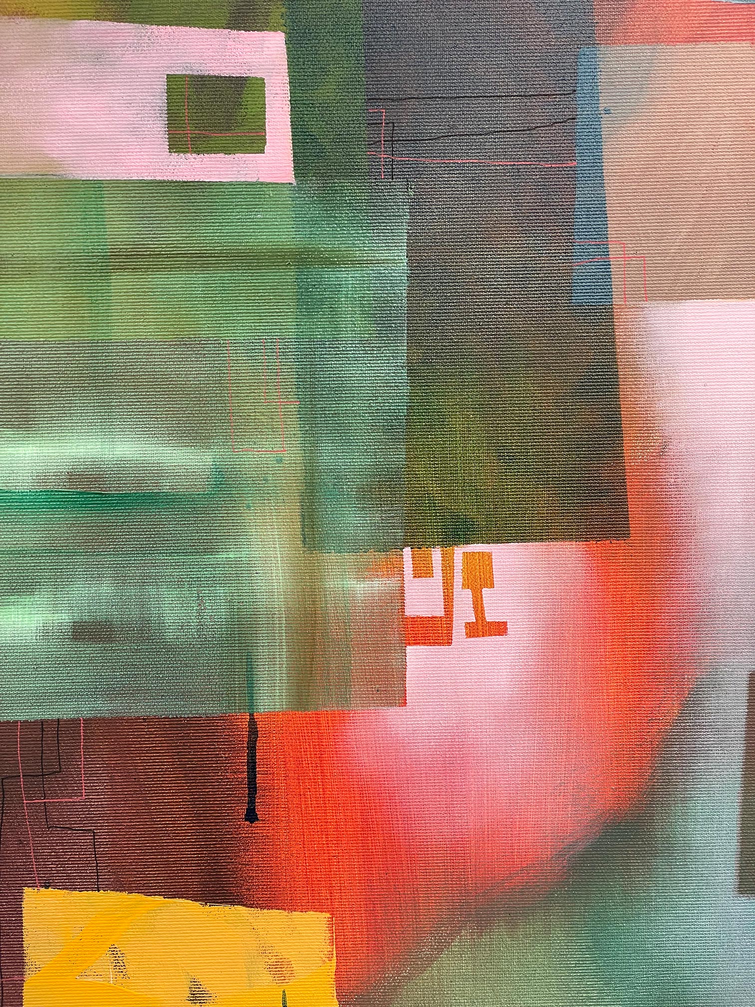 Generous and restless — blocks of teal, sage, red and yellow tumble across a softly blurred ground, each one distinct but none quite settling. The larger canvas gives the composition room to breathe and contradict itself: hard-edged rectangles against smoky, out-of-focus passages that feel like memory rather than paint. Small drawn lines and partial frames mark attempts at structure that the painting keeps outgrowing. The title lands with a wry smile — this is what an idea looks like mid-collision with reality, still colourful, still worth having.